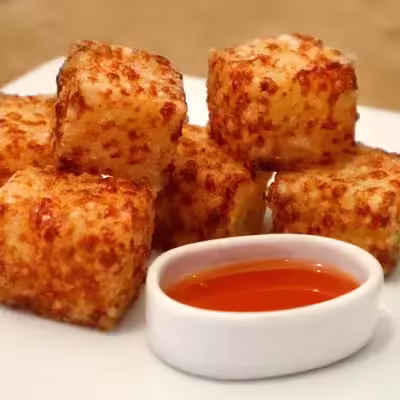 | Como é Servido? | Cubos de tapioca fritos acompanhados de geleia de pimenta, servidos individualmente em sticks. |
