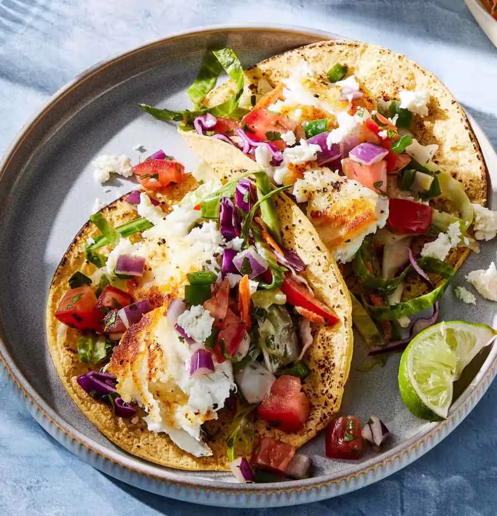 | Como é servido? | Montados na estação de tacos: tortillas quentes recheadas com halibut, ao lado de bowls de slaw picante para montagem na hora. |