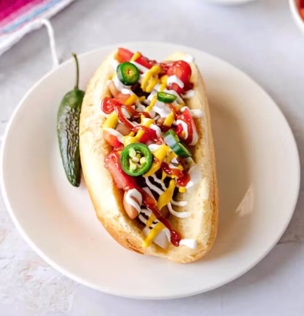 Pão de DOG, Salsicha, Abacate, Bacon Tiras, Tomate Molho, Feijão Carioca, Cebola roxa, Pimenta Jalapeño, Creme de Leite, Pimenta do Reino Preta, Sal, Manteiga, Maionese A, Limão, Coentro