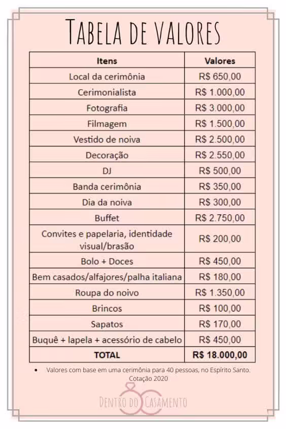 Valor Total Estimado R$19.250,00 / 30 convidados = R$ 650,00 por convidado.