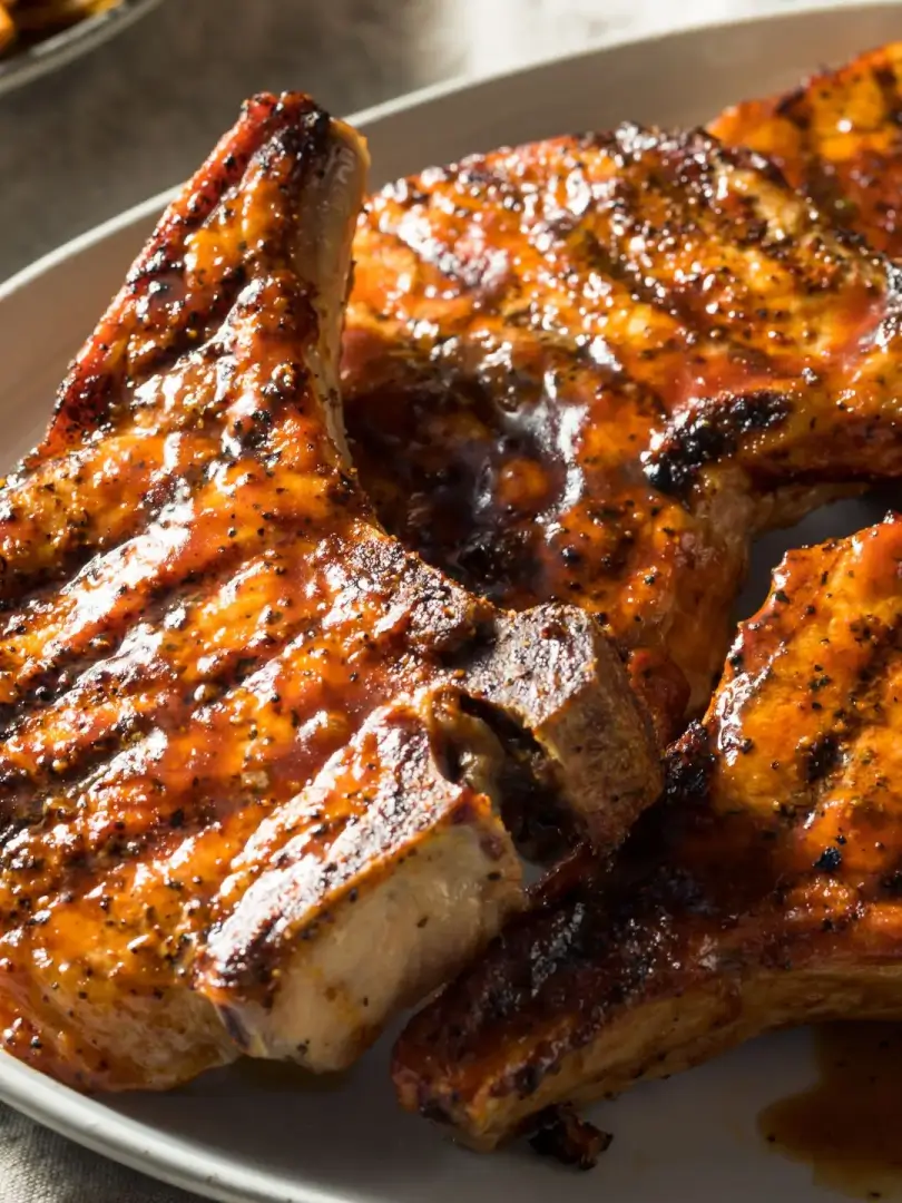Bisteca suína marinada em suco de laranja e ervas, depois defumada e finalizada na grelha para criar camada externa caramelizada e interior suculento.