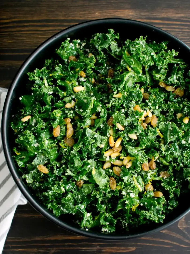 Couve laminada finamente e salteada no alho, mantendo textura e cor vibrante.