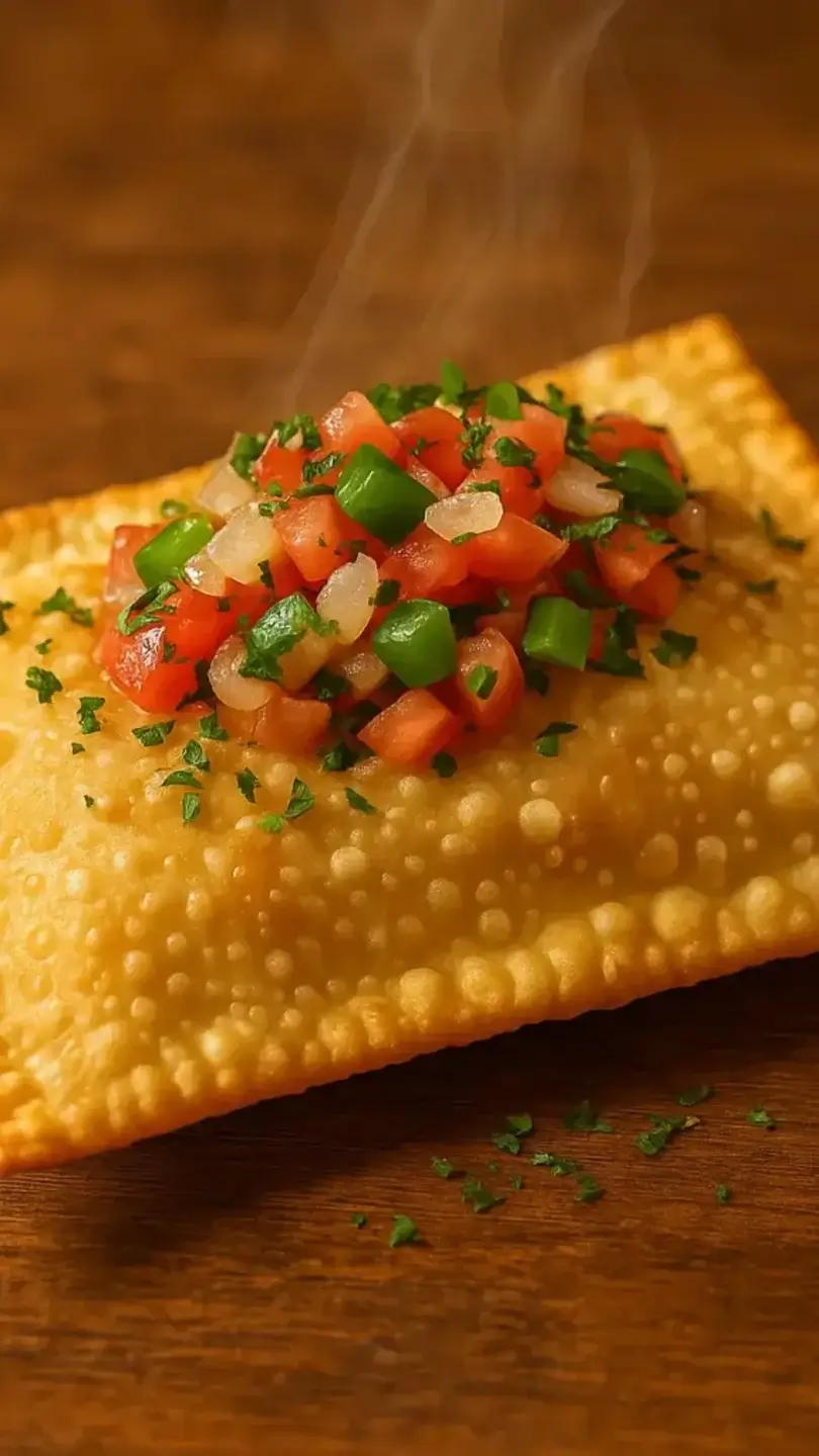 Mandioca amarela cozida até atingir maciez uniforme e depois frita para criar superfície crocante e interior macio.