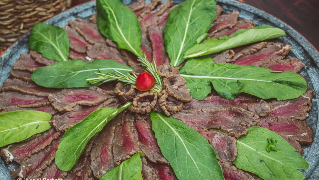 Carpaccio de baby beef ou de peixes: o nosso carpaccio é artesanal, curado em uma marinada ácida com especiarias e servido com rúcula.
