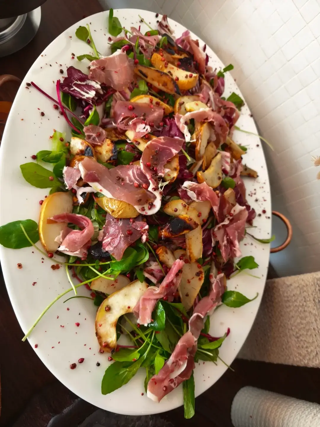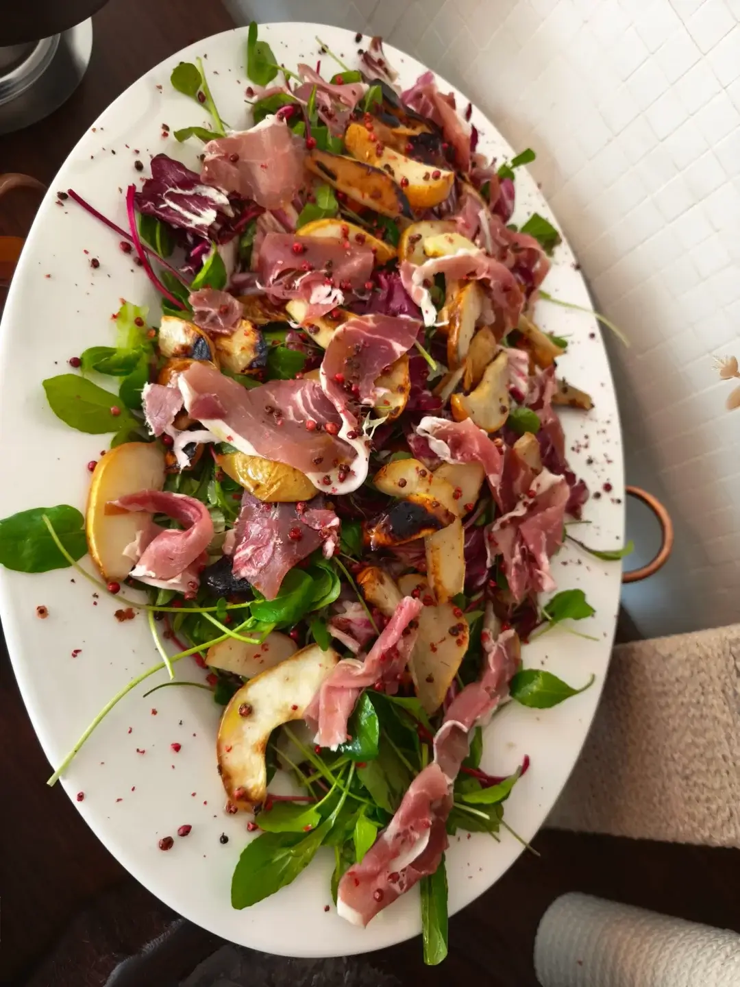 Salada de parma com pera ou pêssego: a fruta é tostada na grelha e temperada com redução de balsâmico.