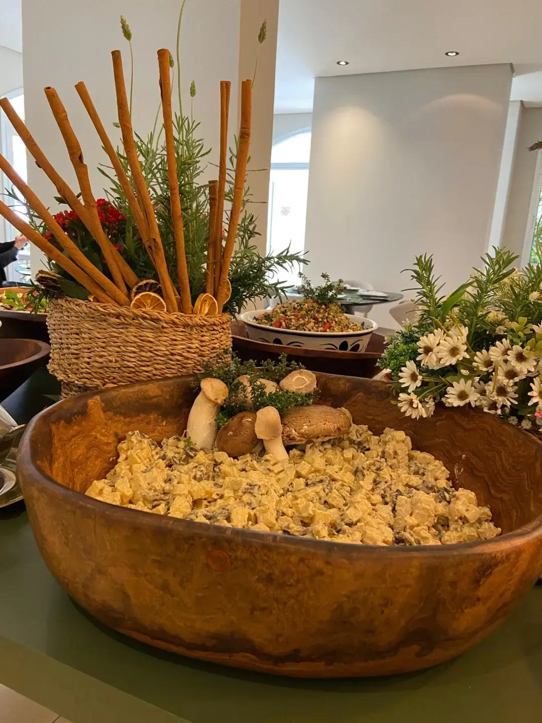 Maionese de batatas com cogumelos: é um mix de cogumelos da estação, maionese com mostarda e vinho branco.